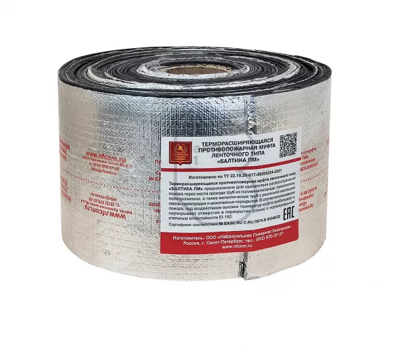 Терморасширяющаяся противопожарная муфта ленточного типа «БАЛТИКА ПМ» предназначена для препятствия распространению пожара через места прохода труб из поливинилхлорида, полиэтилена, полипропилена, а также металлических труб с различной изоляцией сквозь перегородки и межэтажные перекрытия. В случае возникновения пожара, под действием высоких температур муфта срабатывает и перекрывает отверстие в перекрытии (стене) с нормированной степенью огнестойкости до EI-150.