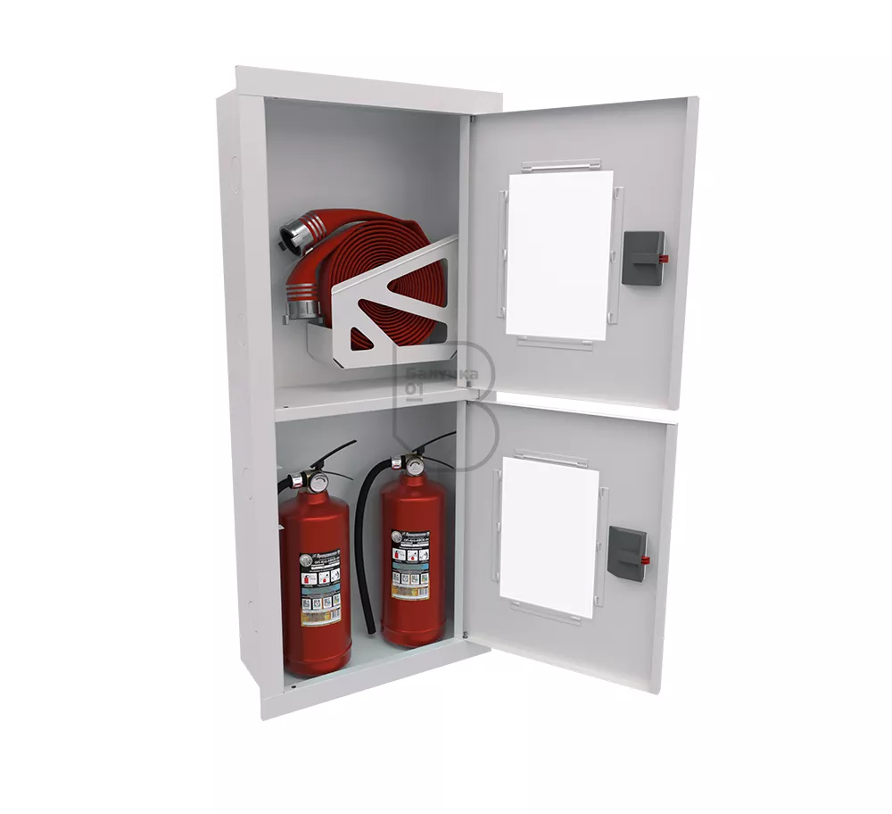 Дверца пожарного шкафа открывается на 160 градусов, открывание двери универсальное (правое и левое). Дверца имеет дополнительные загибы для усиления жесткости конструкции. На двери и корпусе шкафа предусмотрены отверстия для опломбирования шкафа. Дверь пожарного шкафа имеет запорное устройство в виде пластиковой защелки. Дверь закреплена с помощью монтажного штифта, при необходимости она может быть снята в результате простого нажатия на кнопку штифта. На каждой дверце имеется смотровое окно со вставкой из стекла.
