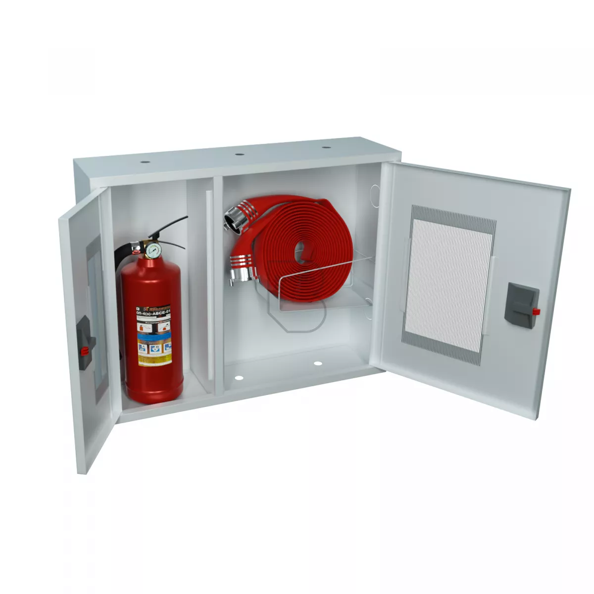 Дверцы пожарного шкафа открываются на 160 градусов. Имеют запорное устройство в виде пластиковой защелки. На каждой дверце имеется смотровое окно со вставкой из поликарбоната.